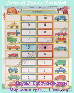 В коллективном блоге "Друзья БабочкиЯночки" проходит интересное мероприятие - ФлешМоб - по русски это значит: совместное изготовление, в данном случае участники делают Детский Домик в разных техниках и разных конструкций. Я решила не только участвовать, но и давать советы и подсказки другим мамам-блоггершам. Так как в технических вопросах и без меня советчиков достаточно, а в технологических - меня лучше не слушать, то самым безвредным с моей стороны будет опубликовать несколько вариантов оформления стенок домика полезными вещами. Про аппликацию я уже писала. Но домики будут для малышей и им необходимо быть не только красивыми, но и познавательными. Для этого есть много путей. Например, поместить на стенки развивающие игры. Несколько таких подходящих я и выбрала из книжки "Домашняя школа" (книга издана в 1995 году и автор не назван), раздел "Игры с числами".