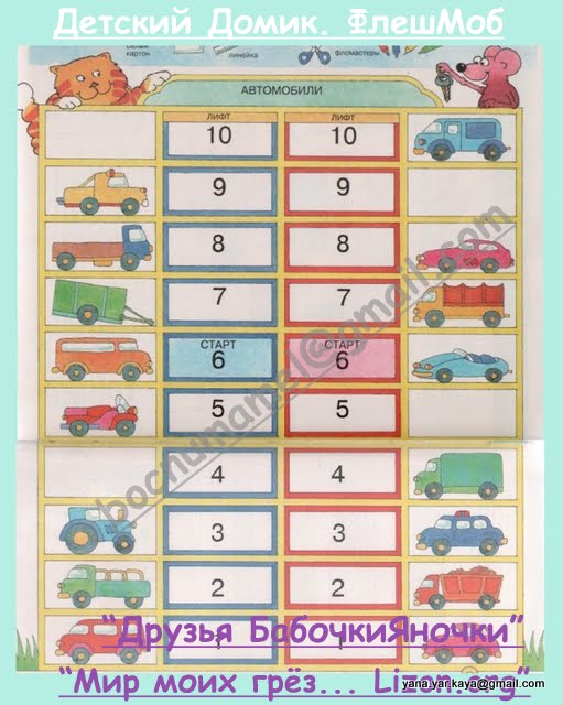 ОтветитьУдалитьНаташа-мама, спасибо за активное участие. Совершенно справедливый вопрос. Сейчас и я обратила внимание, что не только на ПЕРВЫЙ, но и на ВТОРОЙ этаж, а также на самые два верхних мы пока не попадаем. Признаюсь вам честно: я сама тут много придумала, потому что в книжке пустые места только те, что на самом деле там нарисованы, то есть вы начинаете играть только с 4-мя машинками, у каждого игрока по 2. А все остальные места в гараже уже заняты. Я подумала, что это очень скучно - поставить только две машинки и переделала на 10. Получилось, что изначально все места пустые и игра длинная. Сейчас подумаю как выйти из трудного положения. Проверьте-ка,если я добавлю в раздел "Правила игры" такую фразу":"...Отсчитывать нужно от последней занятой стоянки".