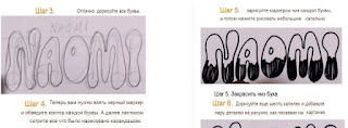 Из интернета я знаю, что дети и подростки любят стиль "графити". Для того чтобы и внук научился писать такие буквы, я распечатала пошаговую инструкцию "как написать слово толстенькими буквами".