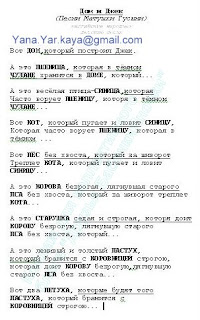 Я знаю, что такого термина не существует. Но у меня такое чуство возникает, когда я читаю эти стихи, как если бы я поднималась по спиральной лестнице. Все три стахотворения - переводы английского детского сериала "Сказки Матушки Гусыни". Помещаю я их сюда в продолжение темы "бесконечный стишок". Почему я считаю их бесконечными? Потому что продолжать их можно сколько угодно долго, их можно начинать снова и снова, ставлять свои идеи. И вообще, по всякому разнообразить. И мне это очень нравится. Тут вы найдете три "картинки", каждая из которых увеличивается и хорошо читается.