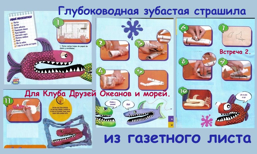 Свернуть толстый рулон из нескольких газетных листов и согнуть его пополам - вот вам основа туловища. Детали оперения - хвост и плавник, глаза и зубы вырезайте из картона.