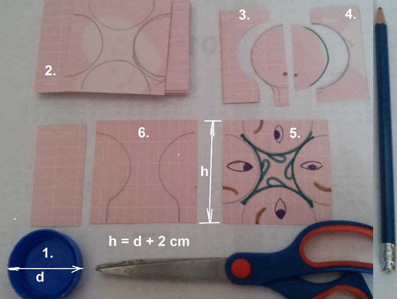 Плясать, как известно, нужно "от печки" - в моем случае это пробка от молочной бутылки (п.1) диаметром 4 см. Катрон для 25 карточек (п.2) со стороной квадрата - 6 см. Ножницы, карандаши, фломастеры, ручка шариковая.