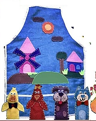 Впервые я встретила информацию о таком театре, когда училась в "Школе кукольного театра" на курсе "Кукла, как инструмент обучения и воспитания". Я законспектировала несколько книг ( с помощью сына немного поняла тексты и срисовала все рисунки) учителей, которые работали в школах и дошкольных центрах. Одним из способов "построить" сцену с декорациями - был фартук, то есть на него нашивали некоторые нужные по ходу действия предметы обстановки: