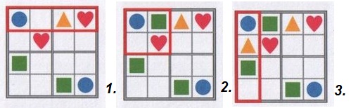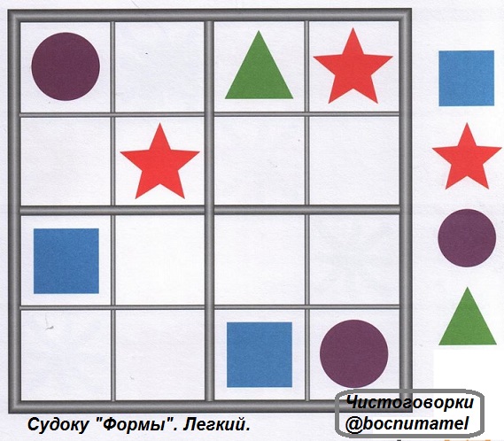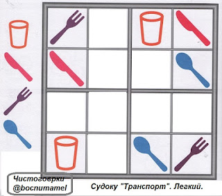 Интрересный вид головоломок - японская игра "Судоку". Попробуйте вместе с детьми решить эти ЛЕГКИЕ задания. Объясните дошкольнику, если он ещё не умеет решать такие задачи, в чем тут логика и как постепенно найти варианты размещения для каждого предмета.