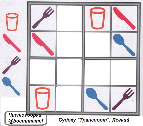 Приступайте к игре - можно нарисовать рамочку на картоне и вырезать 16 квадратиков с картинками. Если хотите, скопируйте и распечатайте приведенные тут сочетания предметов по темам: посуда, формы, транспорт, цвет, одежда.